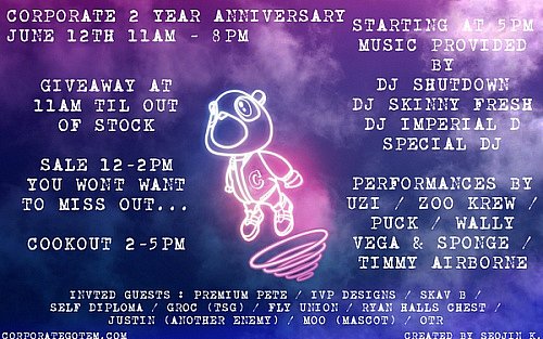 This Saturday, June 12th Corporate will be having the 2 year anniversary Party.. Everyone come out, New era Giveaway untill out of stock, Sale stock 12-2, cookout 2-5... Perfomances By: PUCK WALLY VEGA & SPONGE UZI TIMMY AIRBORNE ZOO KREW... You dont want to miss out.. 11am-8pm..